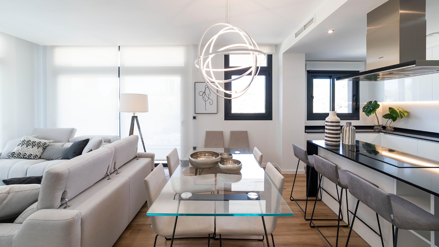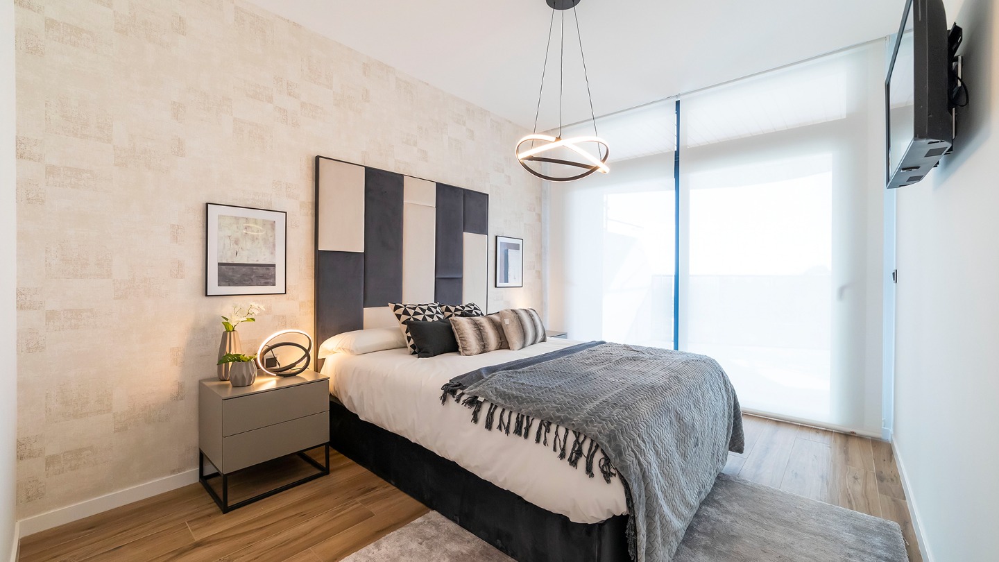 This new development 2nd line, has a unique design with a touch of sophistication that modernises the skyline of the Poniente beach of Benidorm. The properties are built on over 20,000m2 that includes communal and recreational areas totalling more than 10,000m2 and accommodating extensive, well-tended gardens, 3 swimming pools, 3 Jacuzzis, a chill-out lounge area with 2 bars, one wet and one dry, and sun bathing areas by the pools totalling over 2000m2 with natural grass among other features. The extensive line-up at this residential complex also includes a large sports area to make even the most demanding of athletes happy, equipped with a heated swimming pool, a tennis court, a paddle court, multi-sports court, petanque courts and a 150m2 panoramic gym. The children’s playground, the climbing wall and the pool are all within the security perimeter. The large sandy beaches are just 150 metres walk and with bars, restaurants and supermarkets all close by.