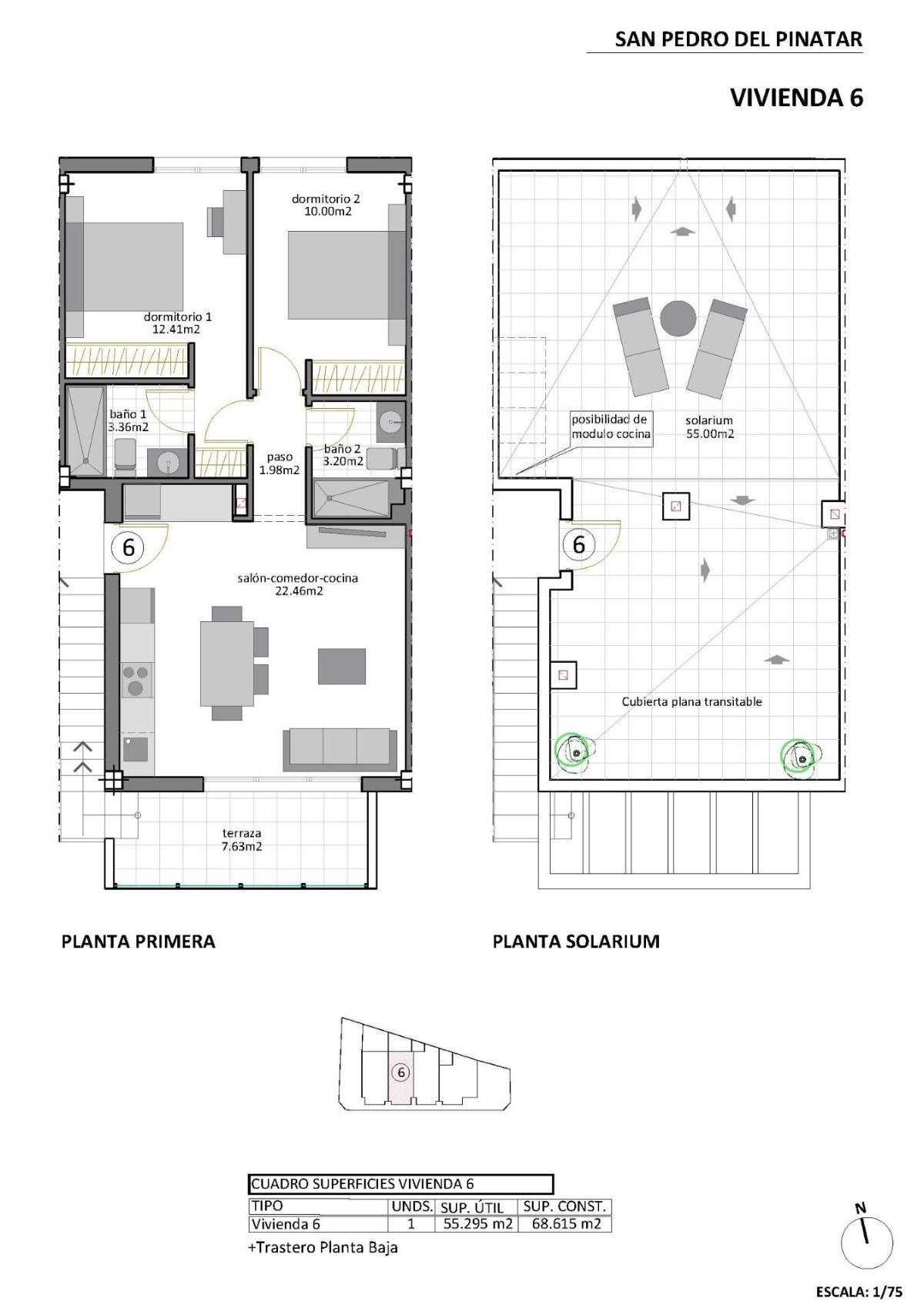 Nieuwbouw Bungalows in San Pedro del Pinatar – Toplocatie op slechts 500m van het strand Exclusieve woningen in boetiekstijl vlakbij de kust Ontdek deze elegante nieuwbouw bungalows in het hart van San Pedro del Pinatar, op slechts 500 meter van de prachtige stranden van de Mar Menor. Dit boetiekproject omvat slechts acht kenmerkende woningen, die modern design, comfort en een rustige levensstijl aan de kust combineren. Beschikbare modellen voor jouw levensstijl Tuin/Begane grond model: Heeft een terras aan de voorkant en een ruime patio aan de achterkant, perfect voor het buitenleven. Penthouse Loft Model: Omvat een privé dakterras en een terras aan de voorkant, met open uitzicht en een overvloed aan zonlicht. Details tuin/ begane grond model Stap binnen in een lichte leefruimte die naadloos aansluit op de eethoek en een volledig ingerichte keuken. Grote glazen schuifdeuren laten natuurlijk licht binnen en creëren een open en uitnodigende sfeer. De indeling omvat twee ruime slaapkamers, waarvan de hoofdslaapkamer met en-suite badkamer en een moderne familiebadkamer. Hoogtepunten Penthouse Model Toegang tot het penthouse via een privétrap die leidt naar een groot terras. Binnen vind je een open woon- en eetruimte in combinatie met een volledig ingerichte keuken. Er zijn twee slaapkamers, waarvan de ouderslaapkamer een en-suite badkamer heeft. Een privésolarium op het dak, toegankelijk vanuit de keuken, biedt een ideale plek voor ontspanning of entertainment. Extra opslagruimte op de begane grond zorgt voor gemak. Belangrijkste kenmerken en voorzieningen Interne en externe LED-verlichting. Volledig ingerichte keuken met inductiekookplaat, oven, vaatwasser en koelkast/vriezer. Airconditioning geïnstalleerd. Speciale parkeerplaats. Aangelegde gemeenschappelijke tuin met zwembad voor bewoners. San Pedro del Pinatar: Kustcharme en gemak San Pedro del Pinatar ligt aan de prachtige kust van Mar Menor en de Middellandse Zee en is een toevluchtsoord voor watersporters, zeilliefhebbers en strandliefhebbers. Het nabijgelegen Lo Pagán biedt natuurlijke modderbaden, rustig water en het hele jaar door voorzieningen, waaronder winkels, restaurants en recreatiefaciliteiten. Afstanden naar de belangrijkste bezienswaardigheden: Winkelcentrum Dos Mares: 5 km Luchthaven Murcia/Corvera: 30 km Luchthaven Alicante: 75 km Plaatselijke golfbanen: 10-20 km Jachthaven en zeilclubs: 2 km Reserveer vandaag nog je droomhuis Met de oplevering gepland voor eind 2025 is dit het perfecte moment om je nieuwe huis in San Pedro del Pinatar veilig te stellen. Mis deze kans niet om te genieten van een mix van moderne elegantie en kustrust. Neem vandaag nog contact met ons op voor meer informatie of een bezichtiging!